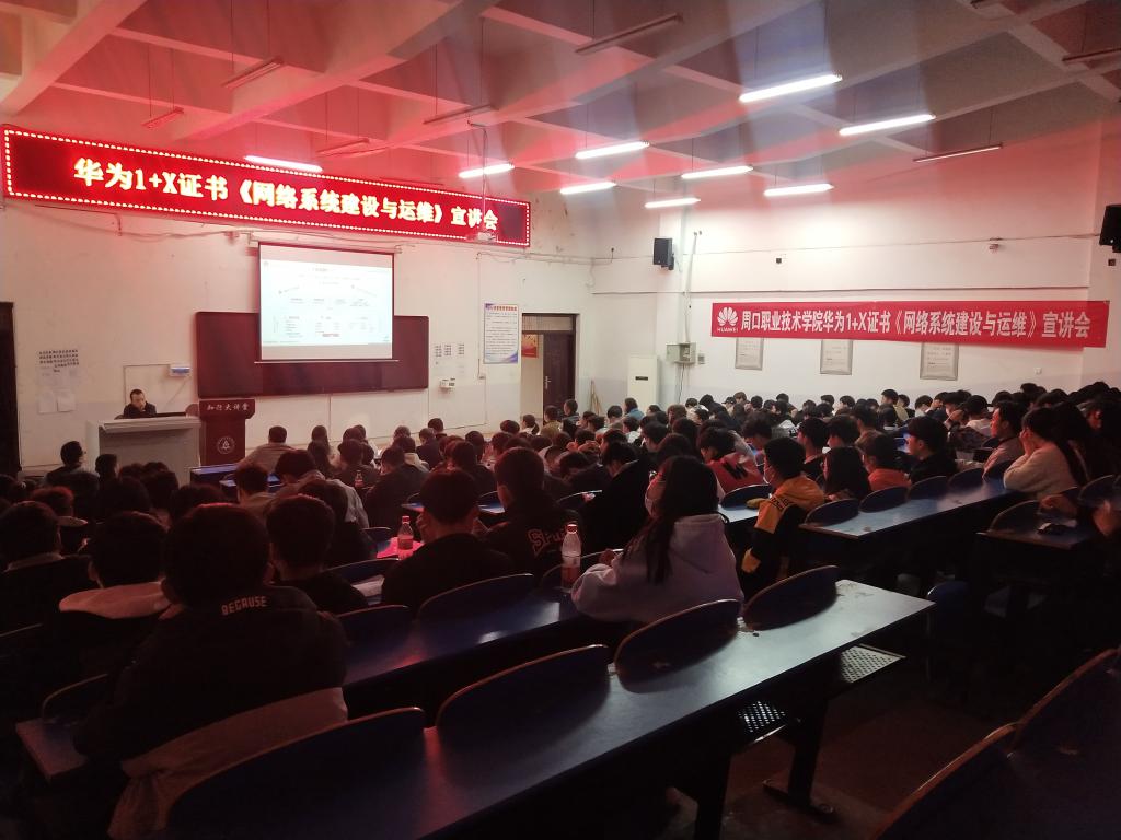 宣讲会上,华为授权培训中心“郑州宇信教育”高级培训讲师详细地解读了国家职业教育1+X证书制度,对“网络系统建设与运维”证书作了细致说明;华为高级讲师寇艳艳对考试形式、题型和注意事项进行了全面的阐述,强调了“1+X证书”试点工作的重要性,并鼓励同学们认真学习,克服困难,积极参与,力争通过1+X证书认证考核。
