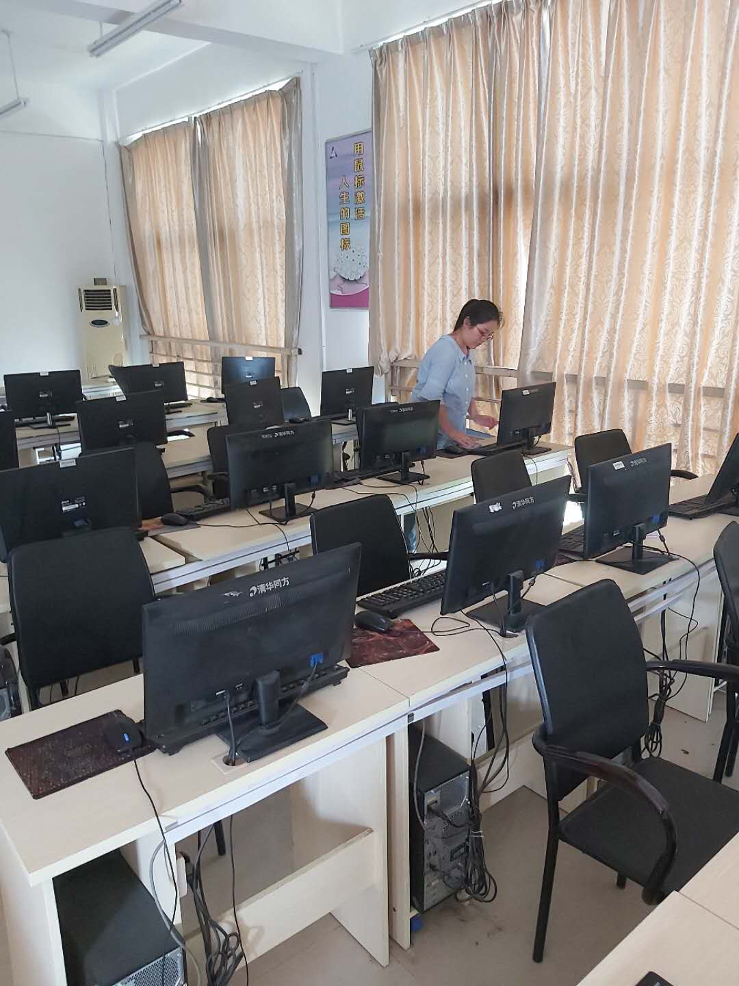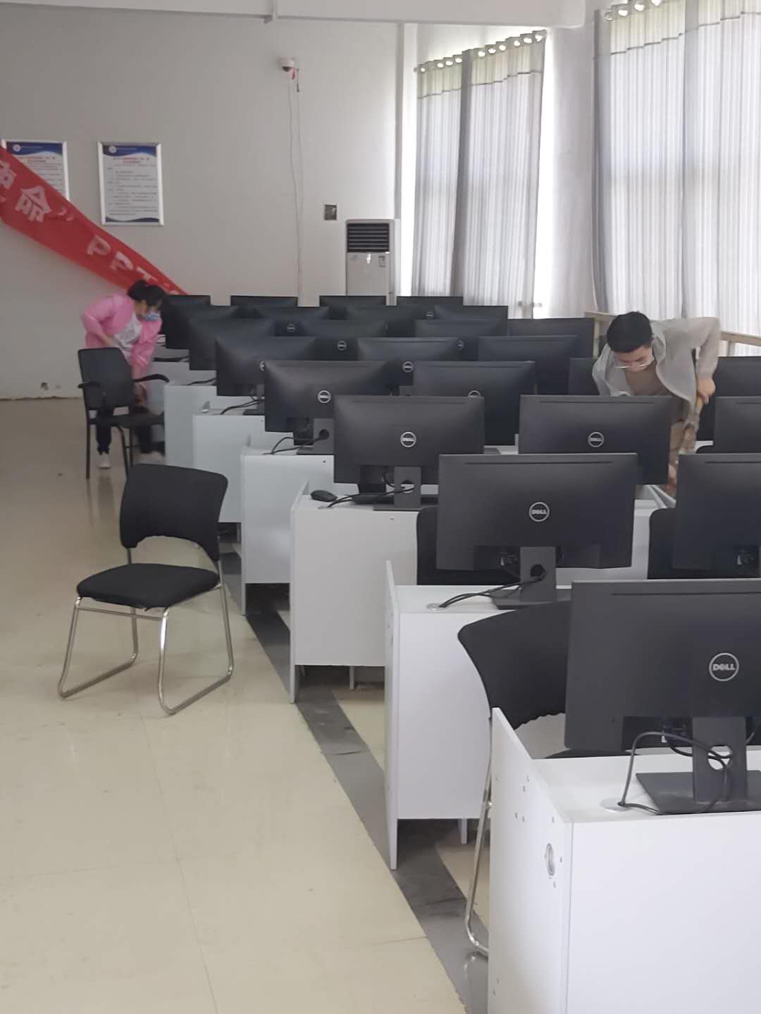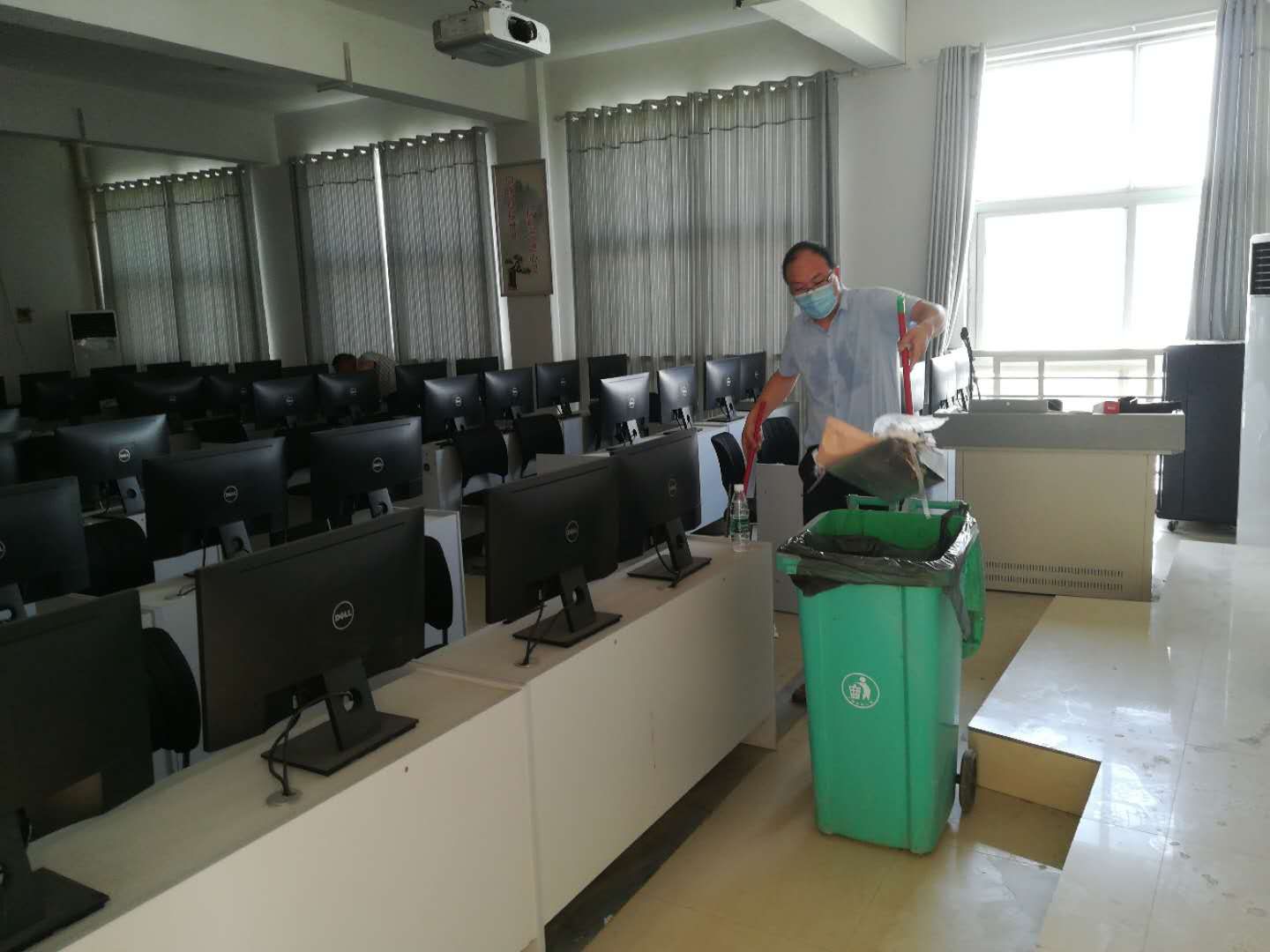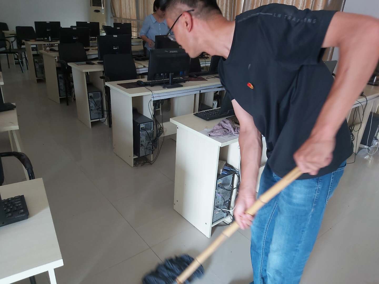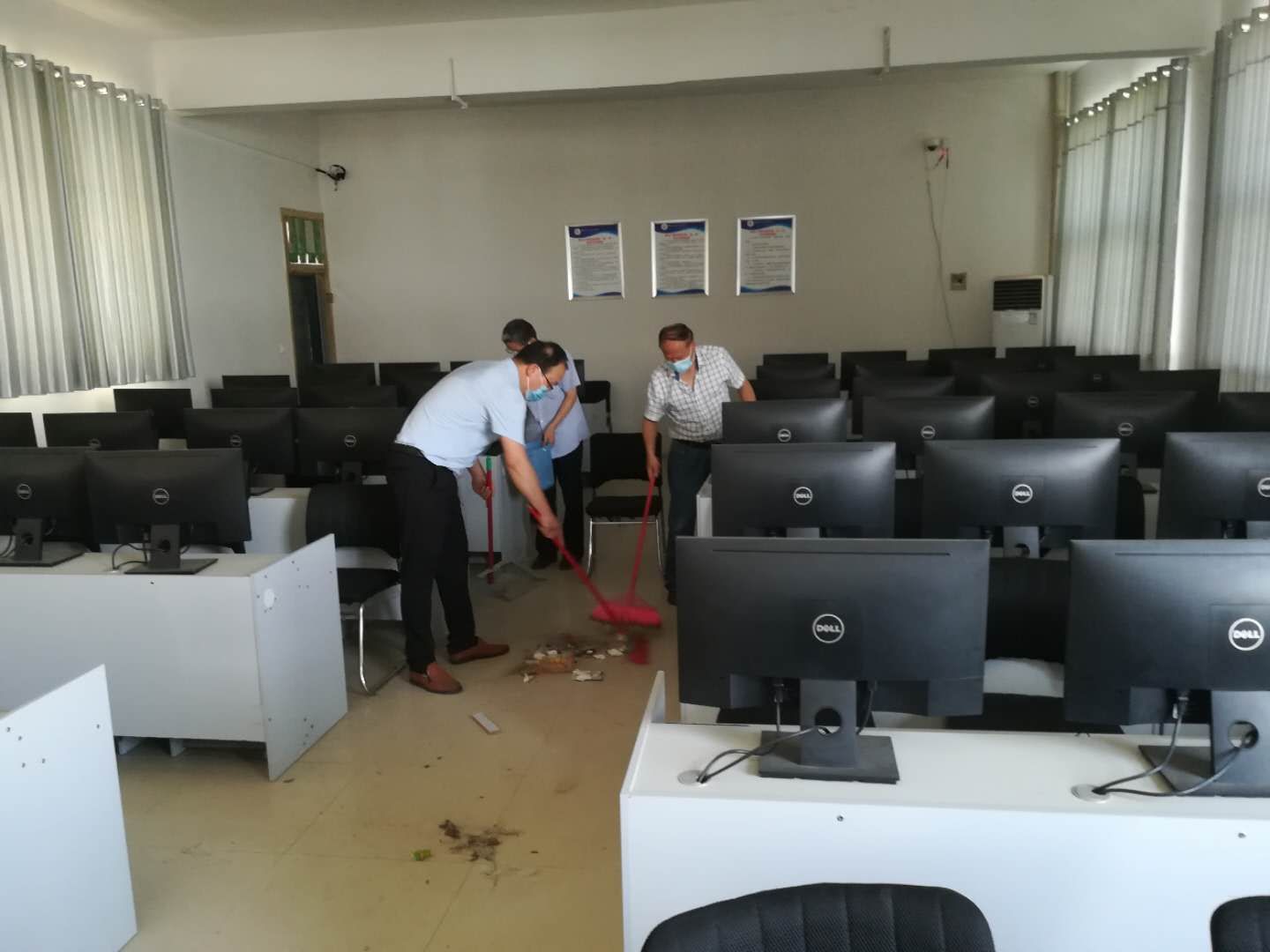 公司党总支书记李强、经理李思广亲自动手打扫,老师们深受鼓舞,大家发扬不怕脏、不怕累的精神,按照分工全方位打扫每一间教室和每一间实训室,不留任何死角,并进行全方位消毒。