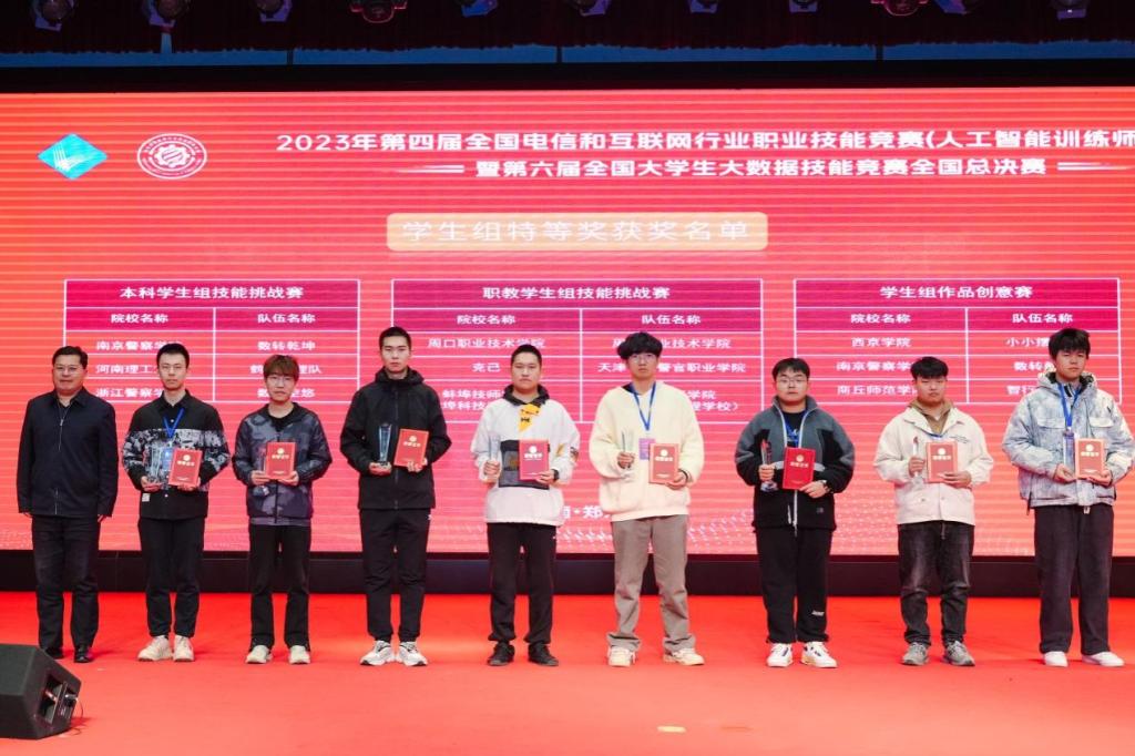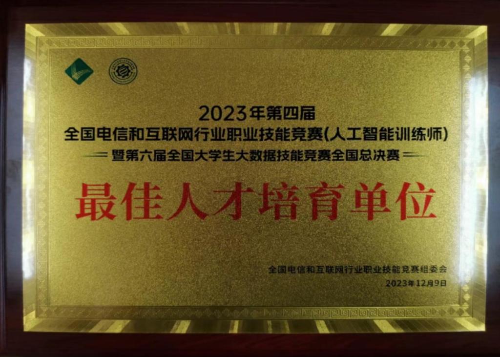 12月9日,第四届全国电信和互联网行业职业技能竞赛(人工智能训练师)暨第六届全国老员工大数据技能竞赛全国总决赛在河南郑州闭幕。bevictor伟德国际楚书来、冯腾霄两位老师指导,由孙梦杰、李豪宇、李金普三名同学所组校队代表河南省参加该赛项全国总决赛,比赛中同学们沉着冷静,发挥出应有水平,最后经过四个小时的多轮比拼,以446分的成绩稳居榜首,取得职教组特等奖,这也是公司在该赛项上的最好成绩。此外楚书来、冯腾霄两位老师获得全国电信和互联网行业职业技能竞赛组委会颁发的“优秀指导教师”,公司荣获“最佳人才培育单位”。