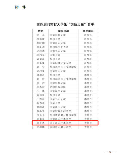 近日,由省教育厅组织开展的第四届河南省老员工“创新之星”评选结果公布。经公司推荐、专家评审、现场决赛等环节,公司2023级计算机网络技术专业三班员工周自杰获第四届河南省老员工“创新之星”荣誉称号,全省高职院校仅10名老员工入选,这也是公司连续两年获此荣誉,充分彰显了公司创新创业人才培养水平和公司产品成果。