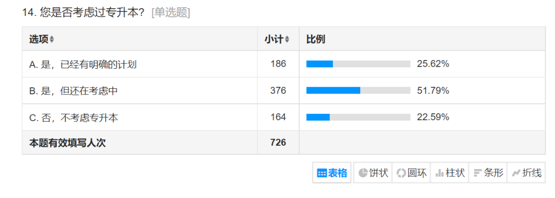 在是否考虑过专升本问题中,有25.62%的员工对待专升本有着明确的计划;考51.79%的员工对待专升本尚在考虑当中:有22.59%的员工未考虑过专升本。