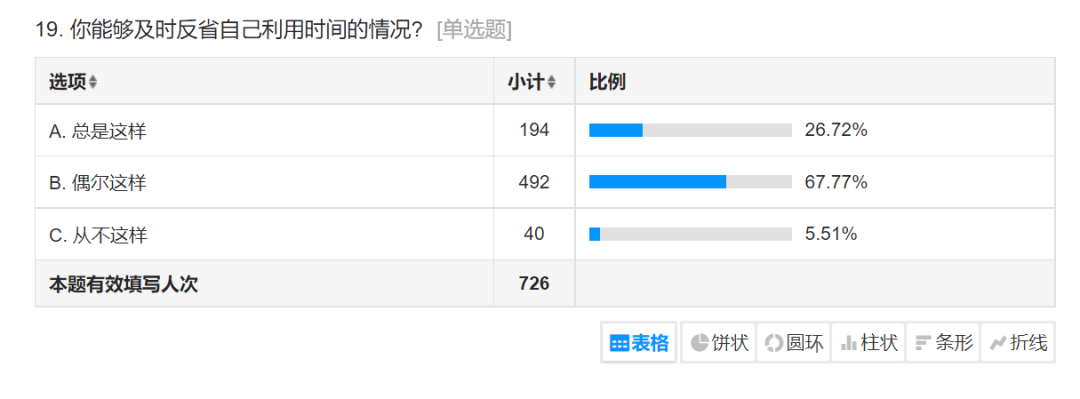 对于员工能够及时反省自己利用时间的情况中,25.72%的员工能够总是及时反省自己利用时间:67.77%的员工偶尔能够及时反省自己利用时间:仅有5.51%的员工从不反省自己利用时间。