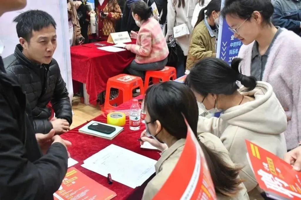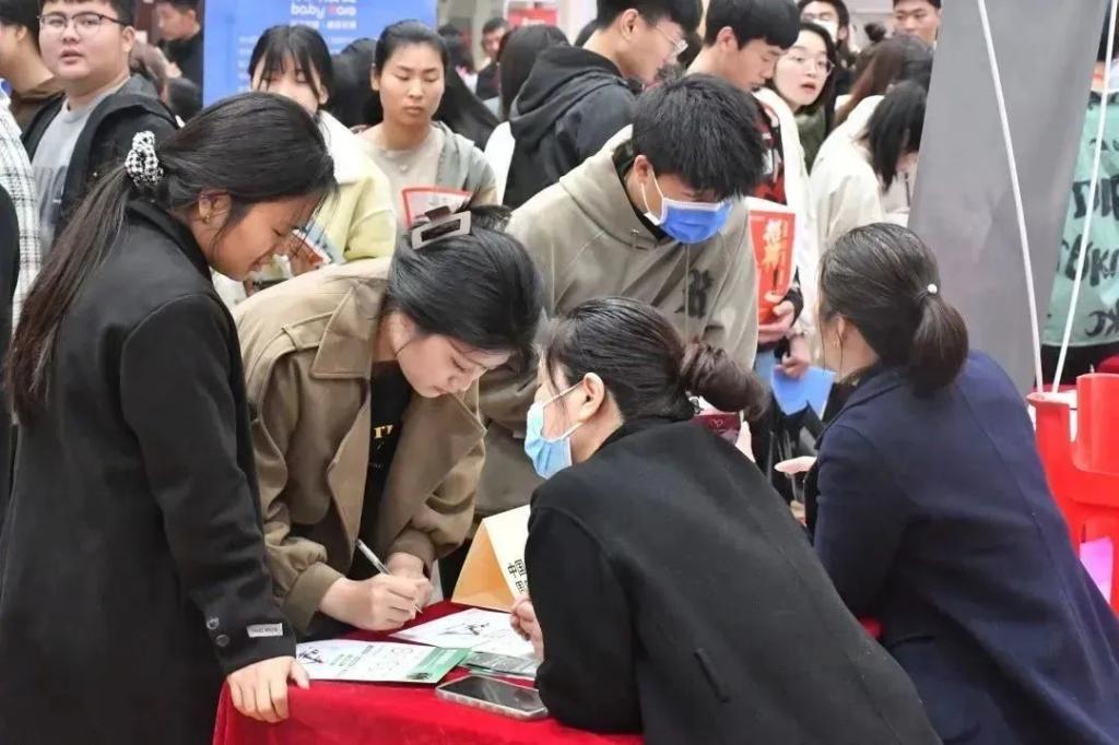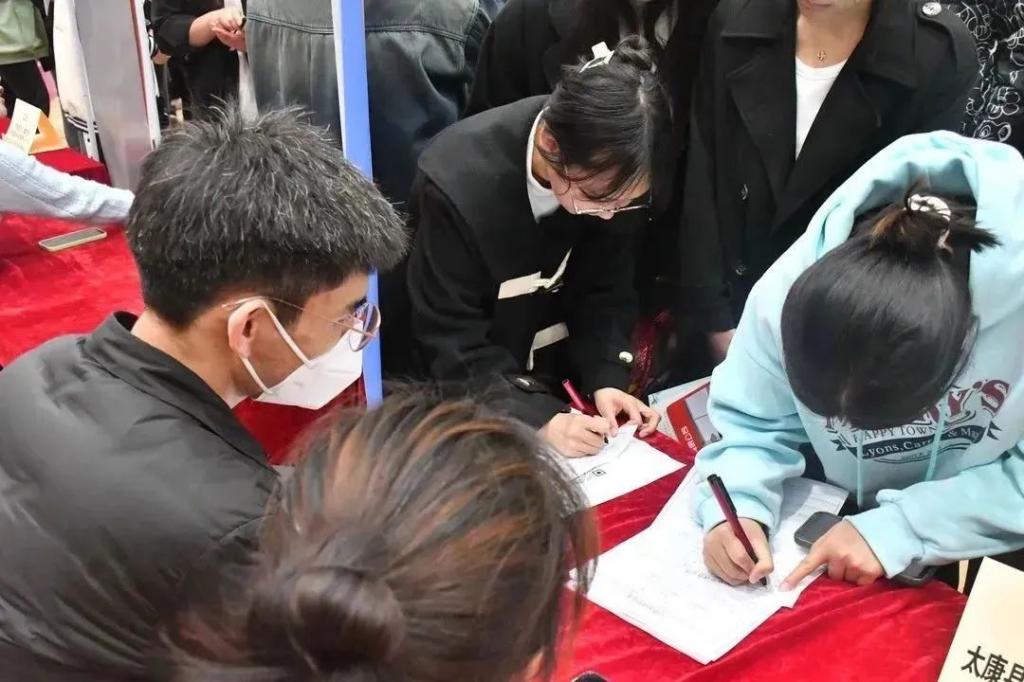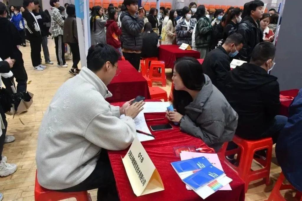 活动期间人潮涌动,公司员工在对口专业工作岗位前积极地咨询,企业工作人员一边发放企业宣传单,一边热情地向老员工介绍岗位信息、企业发展前景、薪资待遇等。