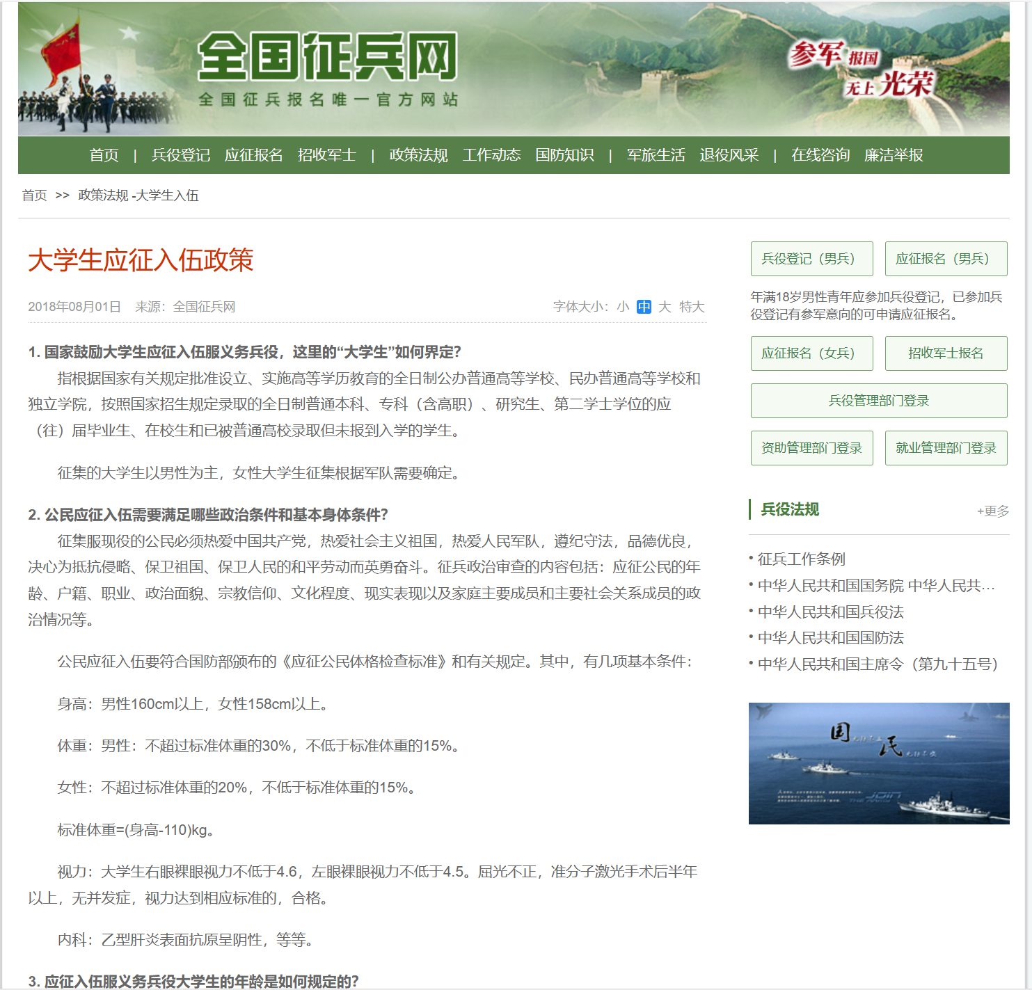 党的十八届以来,一系列涉及军人地位和权益保障的法规政策密集出台、配套完善,军人成为全社会尊崇的职业。2017年9月,习近平总书记给南开大学8名新入伍老员工回信,激发了适龄青年听从祖国召唤、投身绿色军营的极大热情。广大青年特别是在校老员工积极响应号召,到军营建功立业,把参军入伍作为报效祖国的实践路径,在兴军报国中唱响青春之歌。