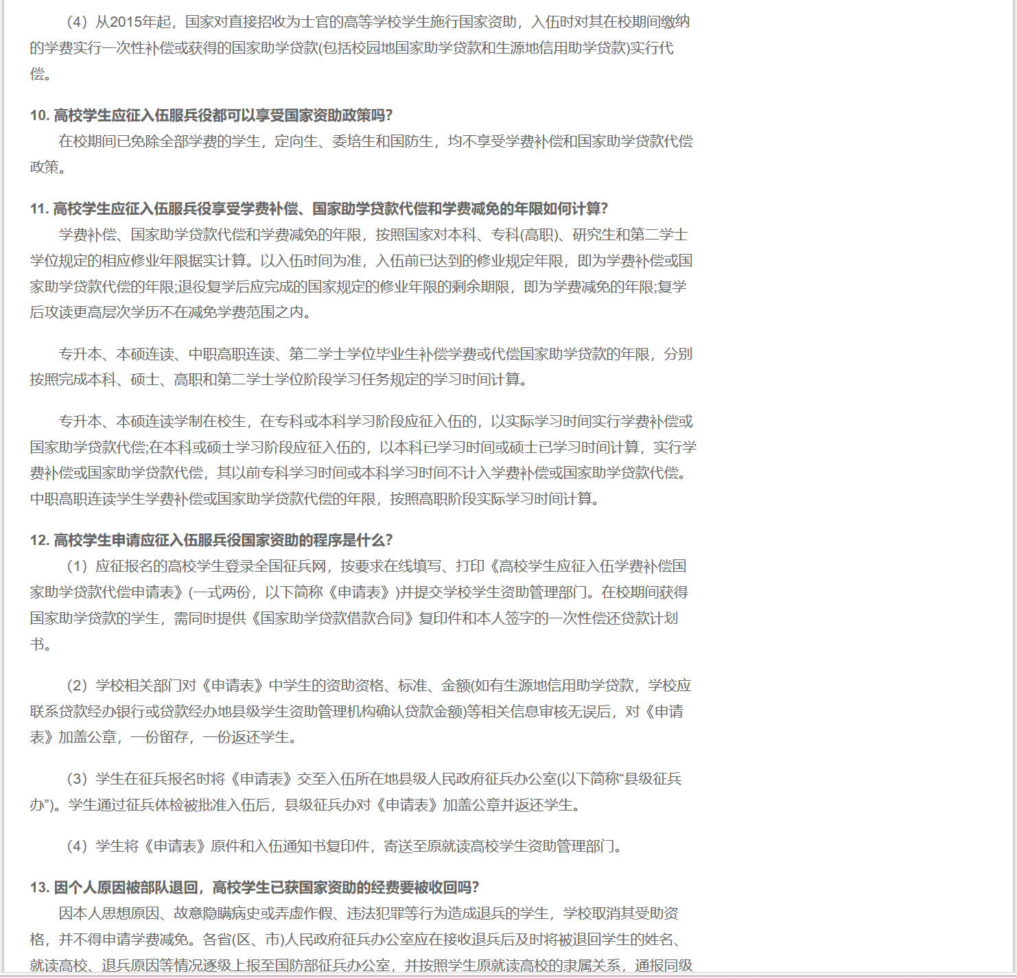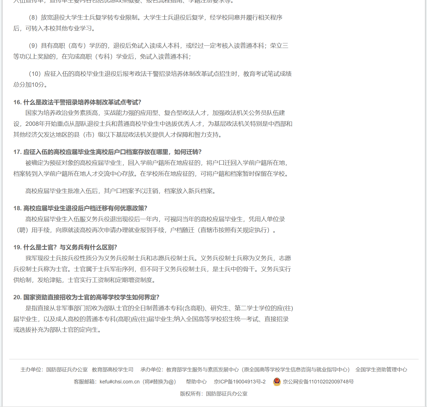 各地把思想政治工作贯穿老员工征兵工作全过程,加强老员工的中国梦强军梦教育、理想信念教育、爱国主义教育和奋斗精神教育,健全包括优先征集、学费资助、考研加分、就业服务等老员工入伍优惠政策,完善覆盖征兵咨询、网上报名、体检政考、学籍管理等多方面的综合服务,推进密切协同的军地合作体系建设,强有力推进老员工征兵工作。教育部还进一步扩大“退役老员工士兵”专项研究生招生规模,研究制定高职(专科)毕业生免试入读普通本科优惠政策,会同中央军委国防动员部,综合衡量老员工所学专业和部队需求,促进精准征集、人岗匹配,更好发挥人才效益。
