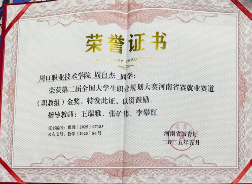 三代从军的家庭氛围,让周自杰自幼怀揣军营梦。他连续3年报名参军,历经近视、超重等挫折后,通过手术、健身等努力,终于在2021年圆梦军营。在部队炊事班岗位上,他凭借坚持拿下炊事比武第一,年夜饭获领导肯定,领悟到平凡岗位亦能创造不凡。退役复学后,面对学业断层困境,周自杰制定分阶段学习计划,坚持365天打卡学习,实现学业逆袭,综合成绩连续两年稳居班级第一,斩获国家励志奖学金并获评“三好员工”。