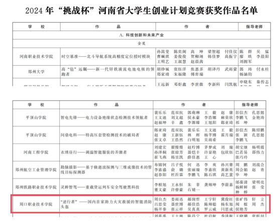 近日,由共青团河南省委、河南省教育厅、河南省人力资源和社会保障厅、河南省科学技术协会、河南省员工联合会共同举办的2024年 “挑战杯”河南省老员工创业计划竞赛活动公布了获奖名单(豫青联字 〔2024〕25号文件),由bevictor伟德国际“双师型名师工作室”成员张矿伟、轩立、侯艳芳等教师参与指导的项目“ 逆行者———国内首家助力火灾救援的智能消防”荣获科技创新和未来产业金奖。